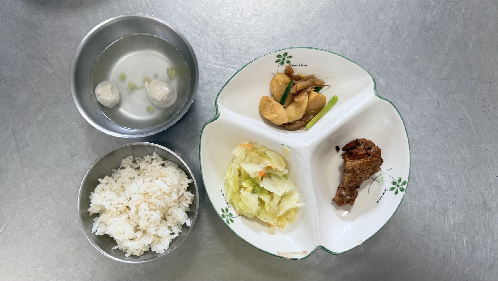 糙米飯、滷雞翅、酸菜麵腸、時令青菜、魚丸芹菜湯