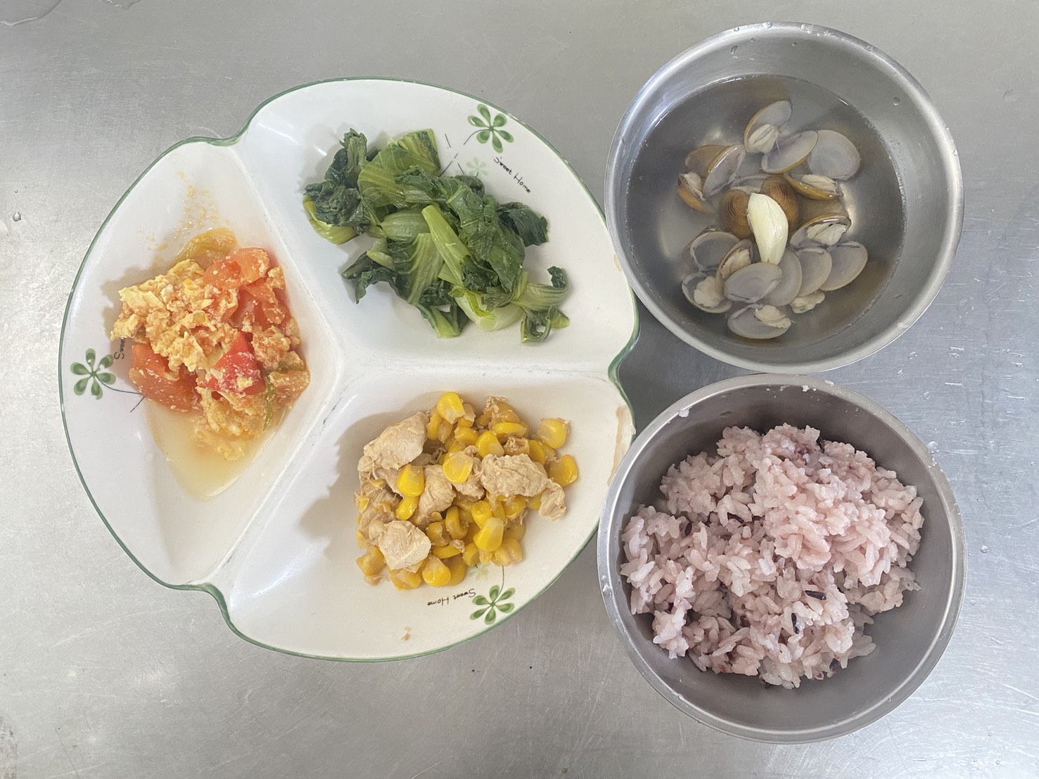 紫米飯、玉米雞丁、番茄炒蛋、時令青菜、蜆仔湯
