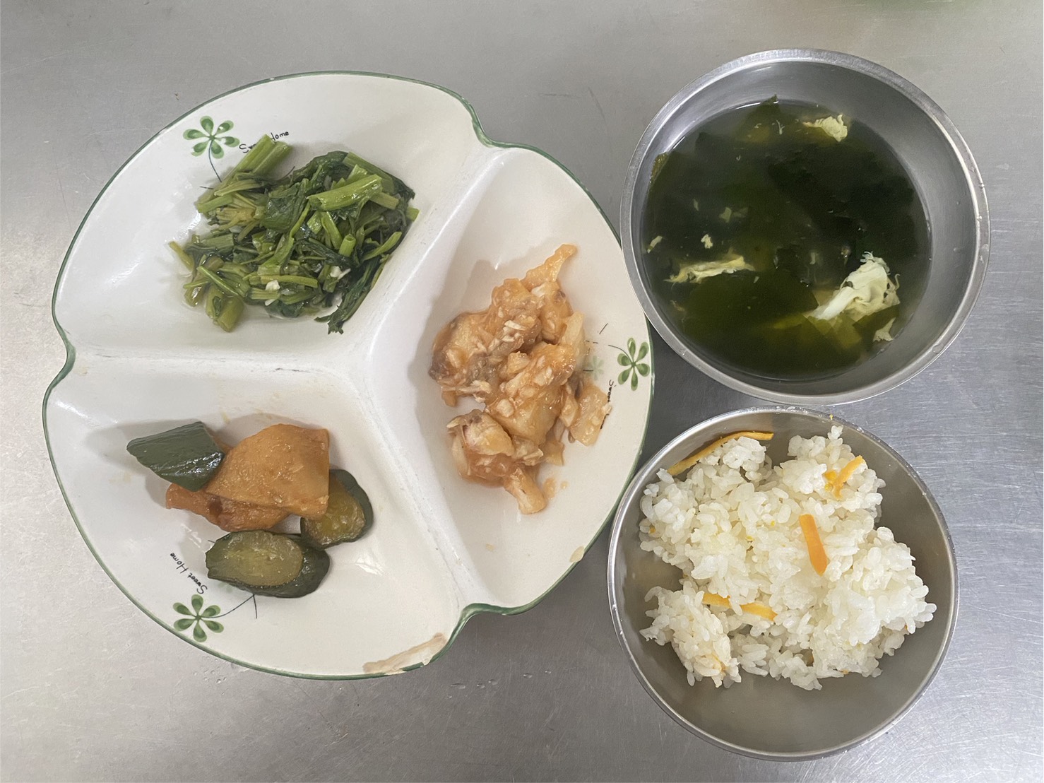 地瓜飯、糖醋魚、青蔥甜不辣、時令蔬菜、海帶湯