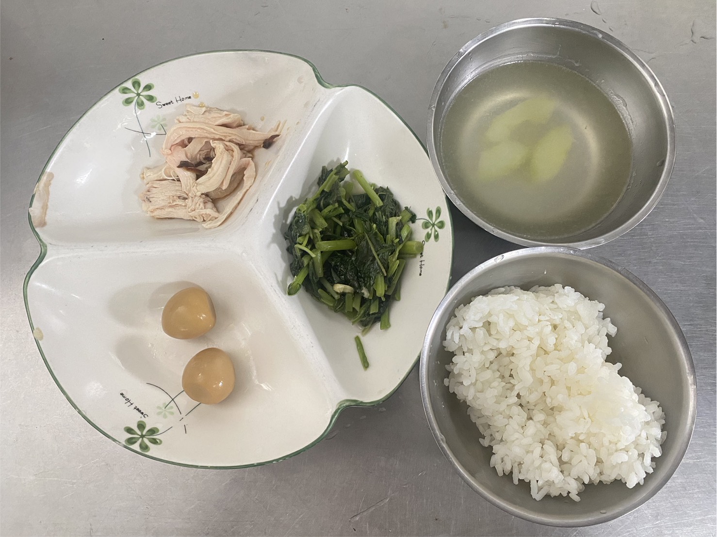 雞絲肉飯、小鳥蛋、時令青菜、大黃瓜湯