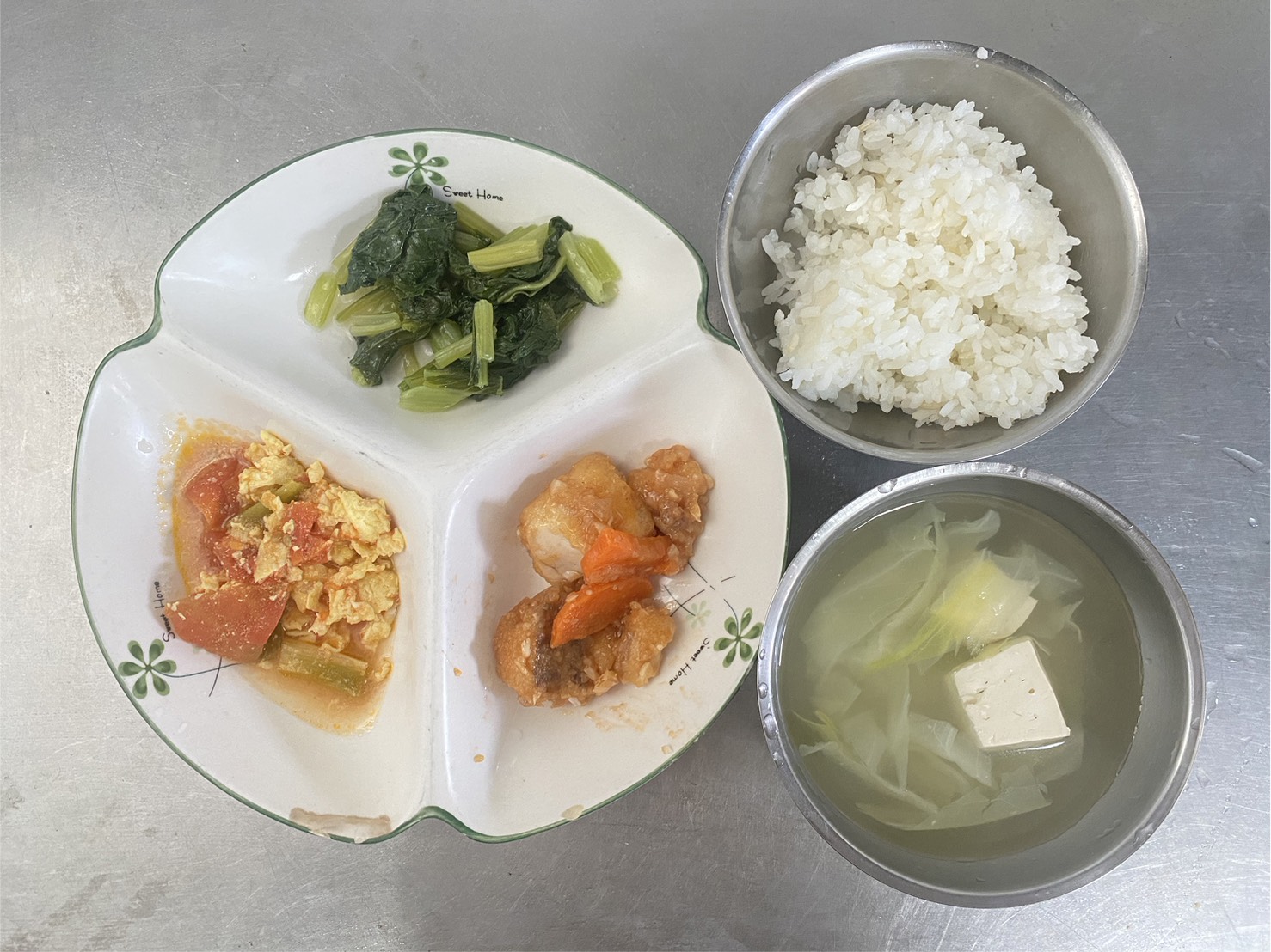 糙米飯、糖醋魚、番茄炒蛋、時令青菜、蔬菜豆腐湯