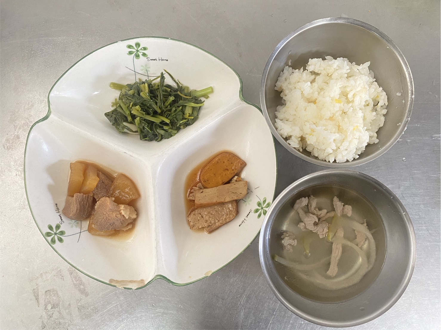 地瓜飯、蘿蔔燉肉、滷油豆腐、時令青菜、榨菜肉絲湯
